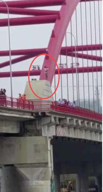 一名男子抱着小孩要跳桥!